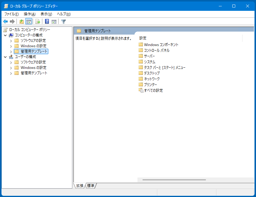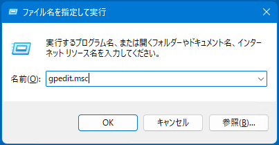 名前に「gpedit.msc」と入力して「OK」をクリックするローカルグループポリシーエディターが起動する。