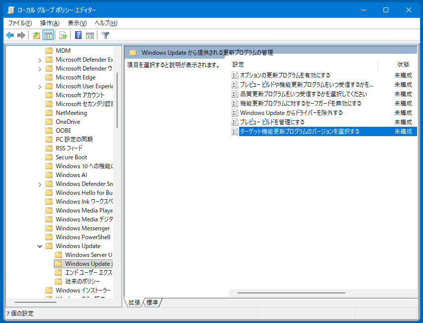 同じように「ターゲット機能更新プログラムのバージョンを選択する」まで行き、未構成を選択して、OS再起動しておきます。